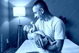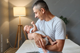 Joyful Caucasian man young dad tenderly hugging his baby daughter or son spending time at home looking at infant newborn kid with love and warm smile