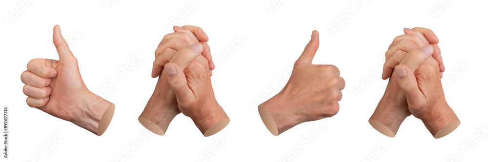 Thump up sign, supporting intertwined fingers, approving thumbup, entwined hands, gestures set, isolated on white background, set..