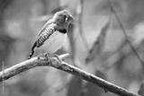 the male zebra finch has a grey body with a white under belly with a black and white tail. It has orange cheeks and black stripe on its face