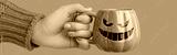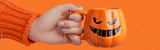 Cappuccino latte coffee in pumpkin cup on orange background. Halloween celebration concept