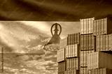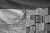 Lesotho flag and big stack of shipping cargo containers in docks with sky background close up