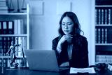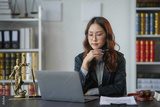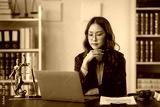 Lawyer is sitting at her desk in her office, working on a laptop. She is thinking about a case and has a pen in her hand