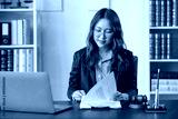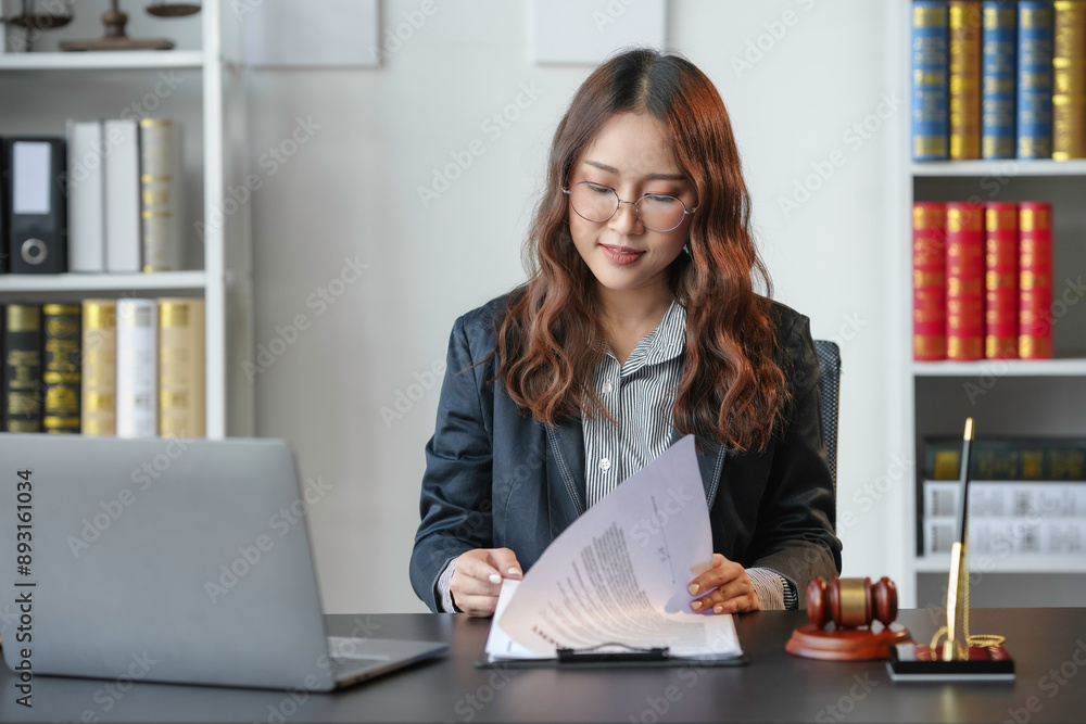Young lawyer focused on legal documents in office, surrounded by law books and paperwork, exuding dedication and expertise