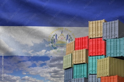 El Salvador flag and big stack of shipping cargo containers in docks with sky background close up