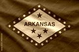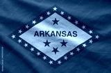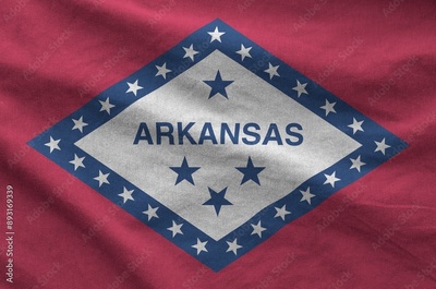 Arkansas US state flag depicted on folded wavy fabric of old cloth close up