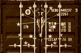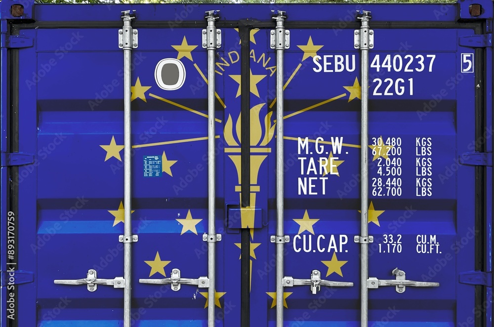 Indiana US state flag depicted on metal doors of shipping cargo container outdoors in docks area close up