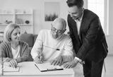 Senior couple, happy old people paper signing clients at lawyer, consultant providing professional advice, counsel. Helping with legal documentation, formal contract, official agreement to buy, sell