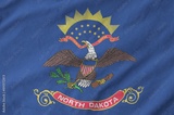 North Dakota US state flag depicted on folded wavy fabric of old cloth close up