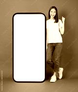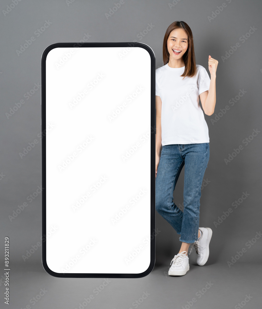 Cheerful and beautiful Asian woman stands beside a large smartphone mockup with a blank screen against a grey background.