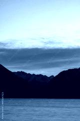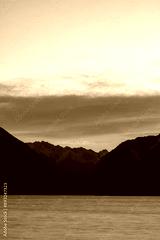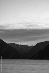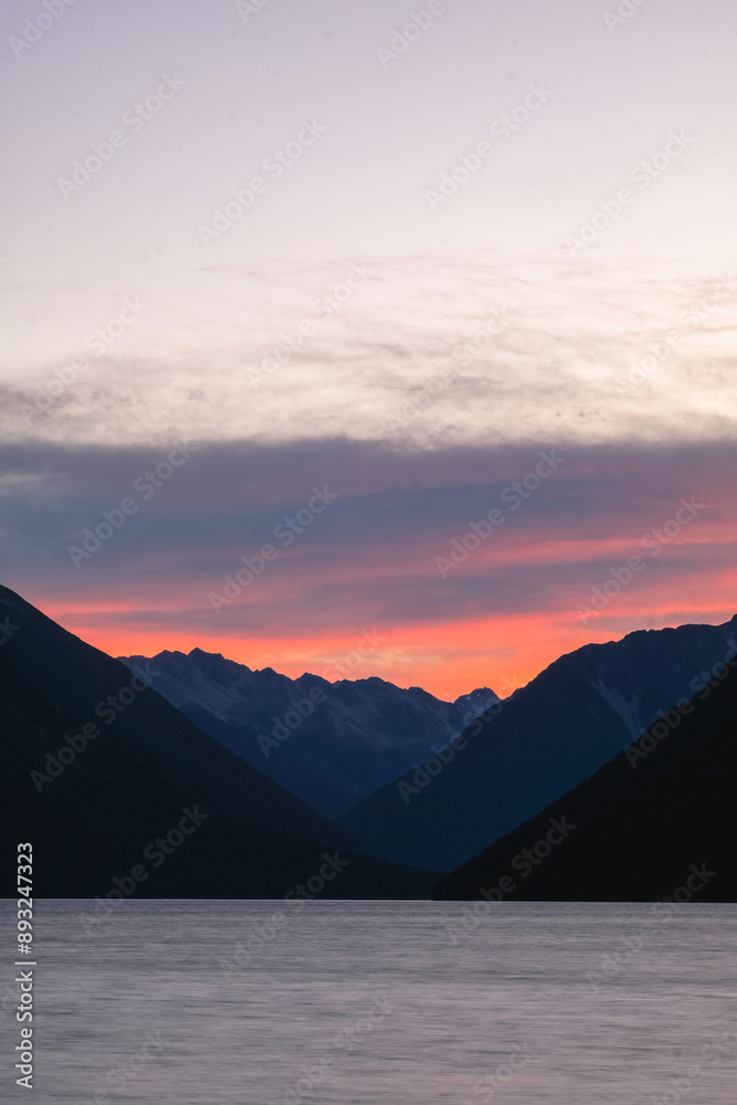 A breathtaking vibrant sunset over a mountain lake, with the sky painted in red, orange, and purple. The serene water reflects the stunning colors, creating a picturesque and peaceful moment of natur