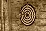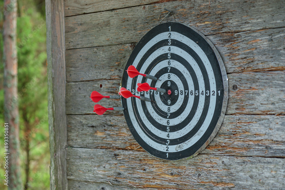 Closeup view of darts with a darts stuck into the board. Wooden wall background. Traditional way to have a rest on a countryside vacation in Finland nature