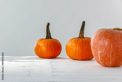 Pumpkins on white table and wall background. Autumn table with copy space for products.