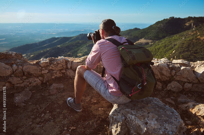 Photographer capturing stunning mountain landscape at sunset from a rocky overlook