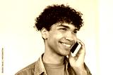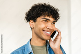 Close-up shot of a young african-american man guy freelancer student manager in smart casual talking on mobile cell phone in white background office while working remote studding