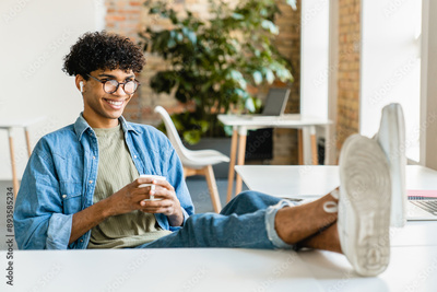 Happy young mixed-race businessman freelancer it marketing worker designer programist student manager intern relaxing resting during work studding break in the office loft cafe coworking