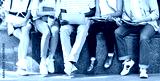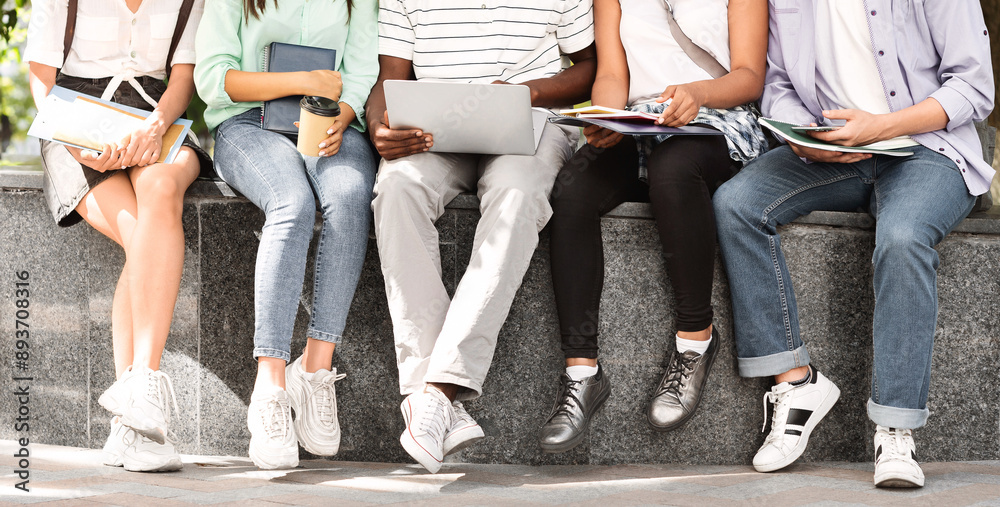 Studying Outdoors. Group of college students sitting with laptop and books, preparing for lectures together, crop