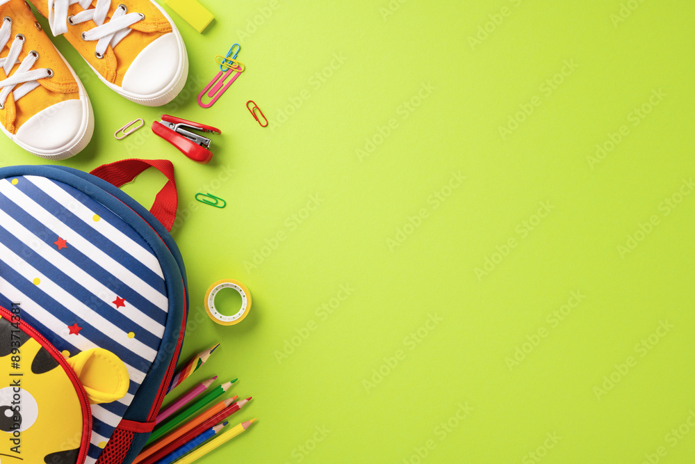Top view of colorful back to school essentials including shoes, backpack, pencils, and paper clips on a green background