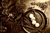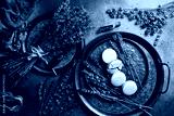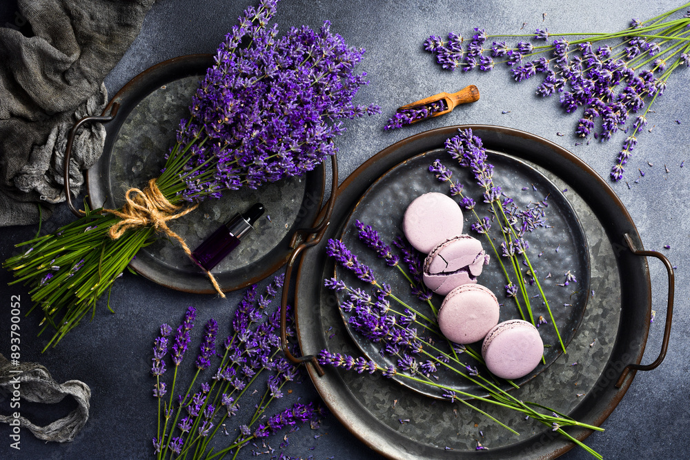 French macarons with lavender flavor and fresh lavender flowers, on a stone plate. Top view.