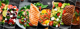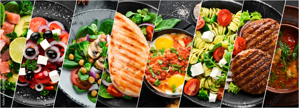 Background of food dishes and snacks. Photo collage, banner from photos.