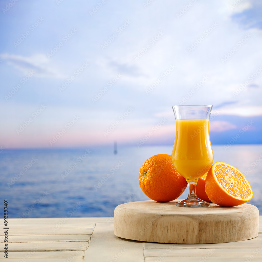 Orange fruit and orange juice on white wooden board table with seascape with blue sky background. Copy space for products.