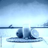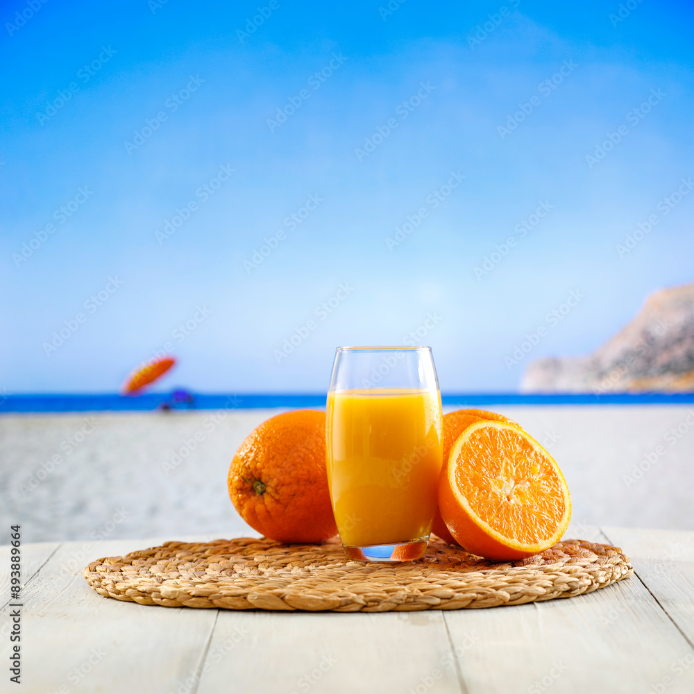 Orange fruit and orange juice on white wooden board table with seascape with blue sky background. Copy space for products.