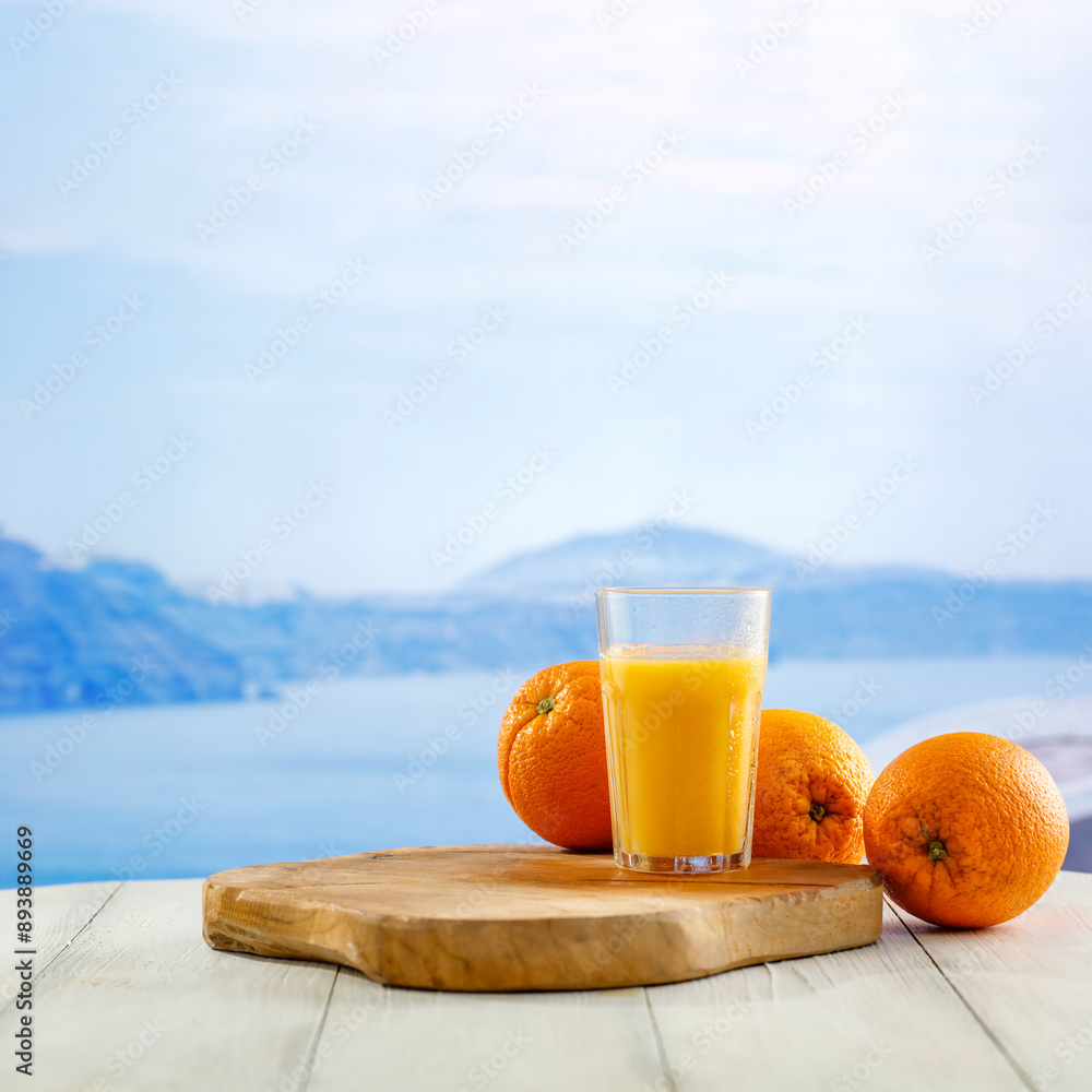 Orange fruit and orange juice on white wooden board table with seascape with blue sky background. Copy space for products.