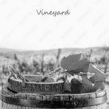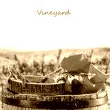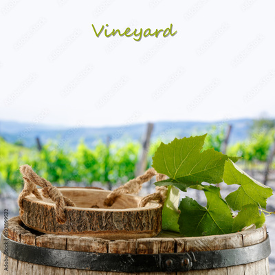 Old wooden wine barrel with green grapevine leaf and blurred vineyard background. Copy space for products and food and drink.