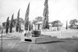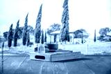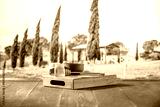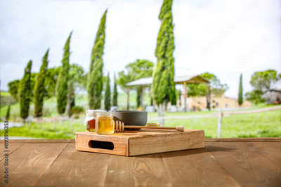 Glass jar of honey on wooden table with nature green garden and trees Tuscany background. Outdoor background and copy space advertising products.