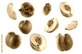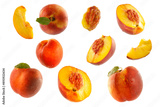 Whole pechaes, halved and sliced peaches isolated on white background. Fruit food product for montage.