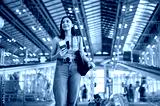 An attractive, happy Asian female tourist passenger with her belongings is on the airport escalator.