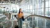 A gorgeous young Asian female tourist passenger is on an airport escalator, carrying her luggage.