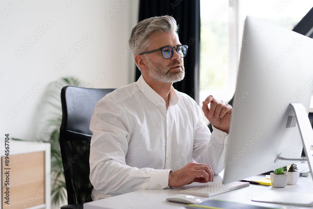 Mature Businessman Working On Desktop Computer In Modern Office, Concentrated And Focused