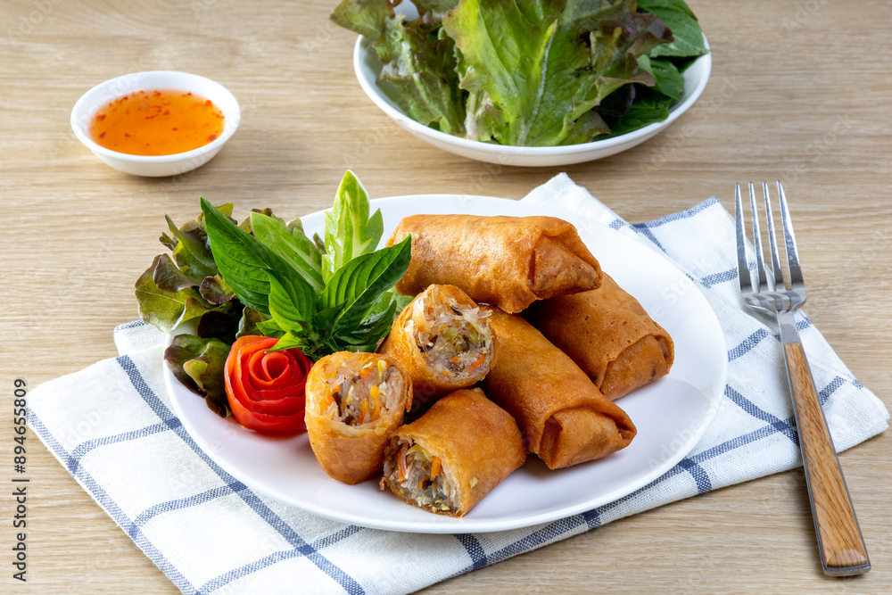 Fried spring rolls on the wooden table