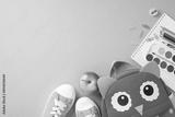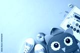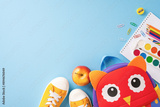 Top view of back to school essentials including shoes, backpack, apple, and school supplies on blue background