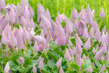 Selective focus of purple pink flowers with green leaves in the garden, Ptilotus exaltatus or commonly known as pink mulla mulla, Flowering plant in family of Amaranthaceae, Natural floral background.