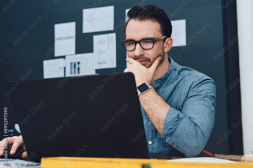 Laptop, architect and planning in office for building project, thinking and design research. Computer, man and young engineer in workplace for contractor, development and industrial blueprint
