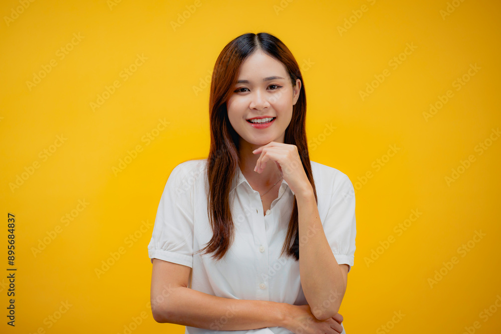 Woman confidence smiling with pleasure and looking on camera isolated over yellow background