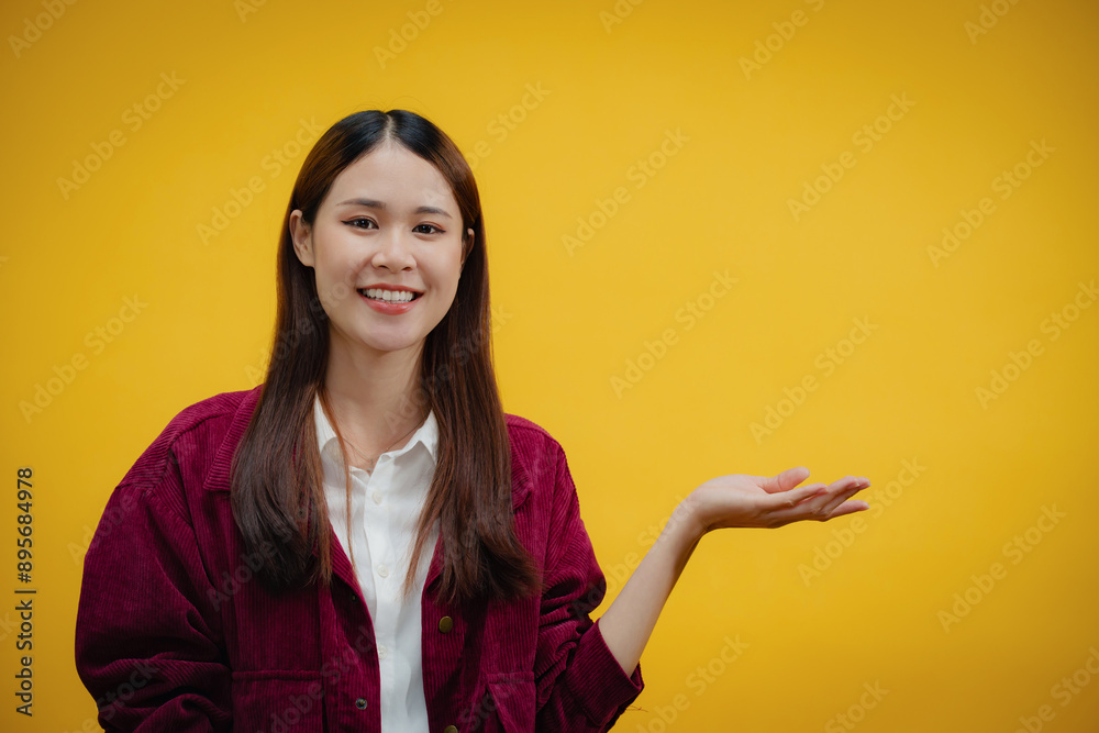 Woman smiling and holding on palm to advertisement with empty space isolated over yellow background