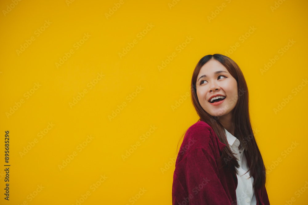 Woman smiling with pleasure and looking advertisement empty space isolated over yellow background