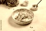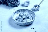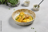 Creamy Polenta with Chicken Thigh and Cheese Sauce in Rustic Bowl