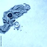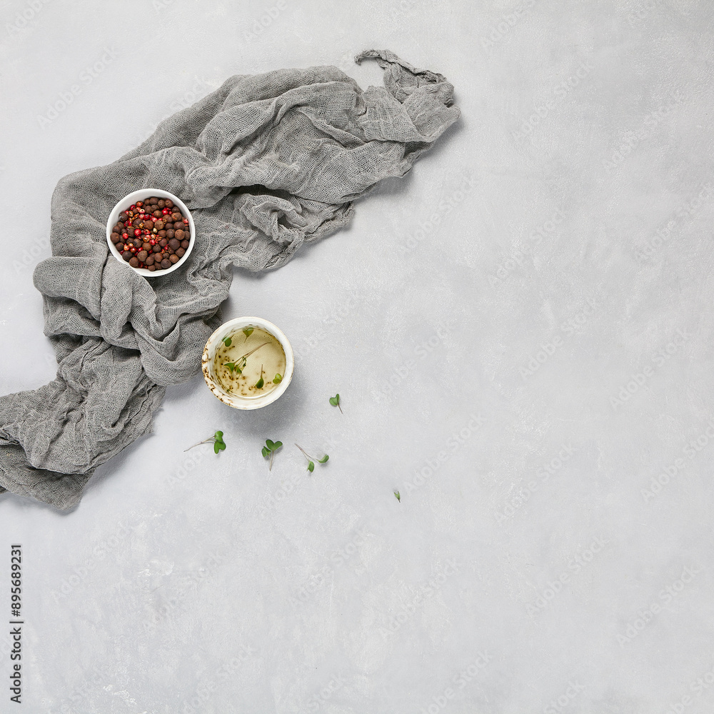 Minimalist Culinary Ingredients with Grey Cloth on Concrete Surface - Overhead View
