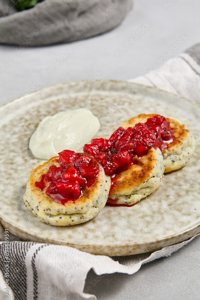 Delicious Cottage Cheese Pancakes with Poppy Seeds and Cherry Compote