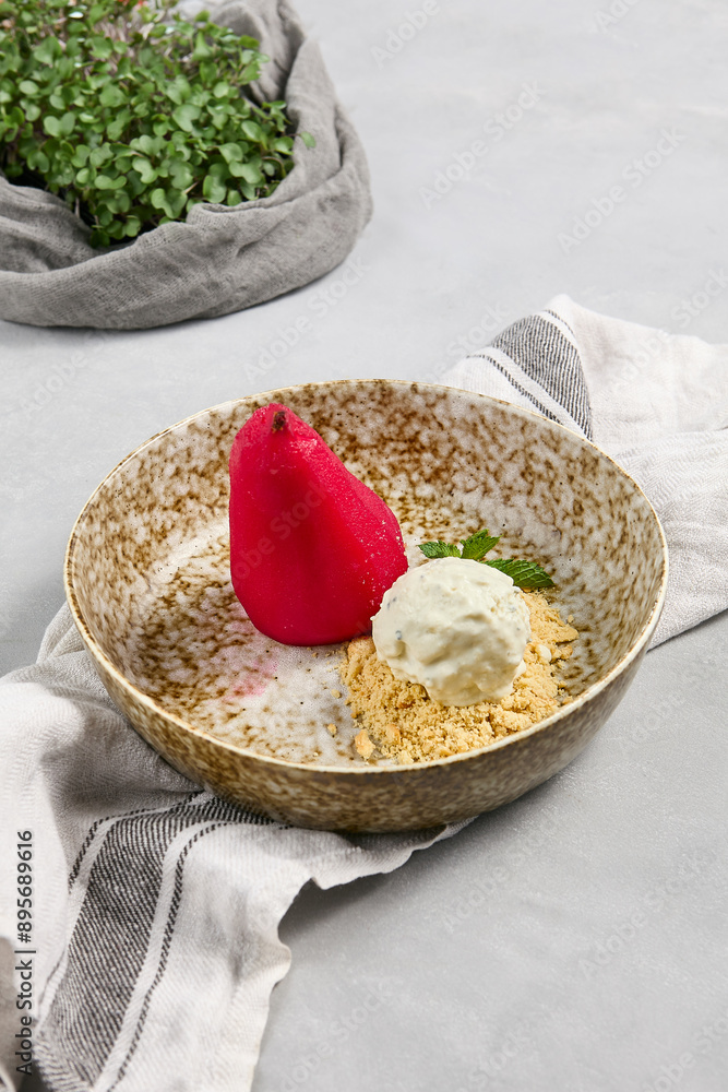 Gourmet Dessert Pear in Wine with Cheese Ice Cream in Artistic Presentation