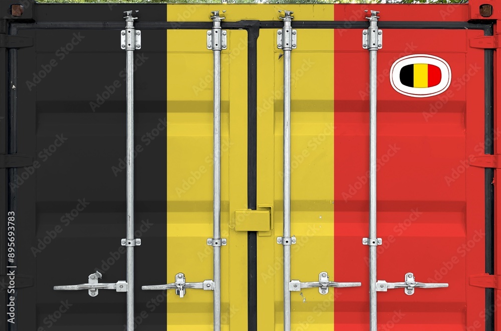 Belgium flag depicted on metal doors of shipping cargo container outdoors in docks area close up