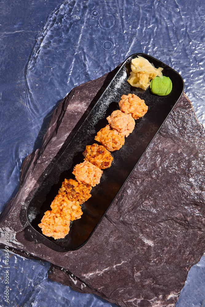 Set of Baked Spicy Sushi on Black Plate with Ginger and Wasabi on Rock Surface