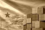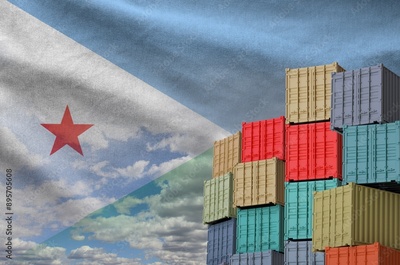 Djibouti flag and big stack of shipping cargo containers in docks with sky background close up