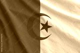 Algeria flag depicted on folded wavy fabric of old cloth close up