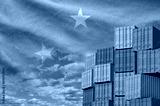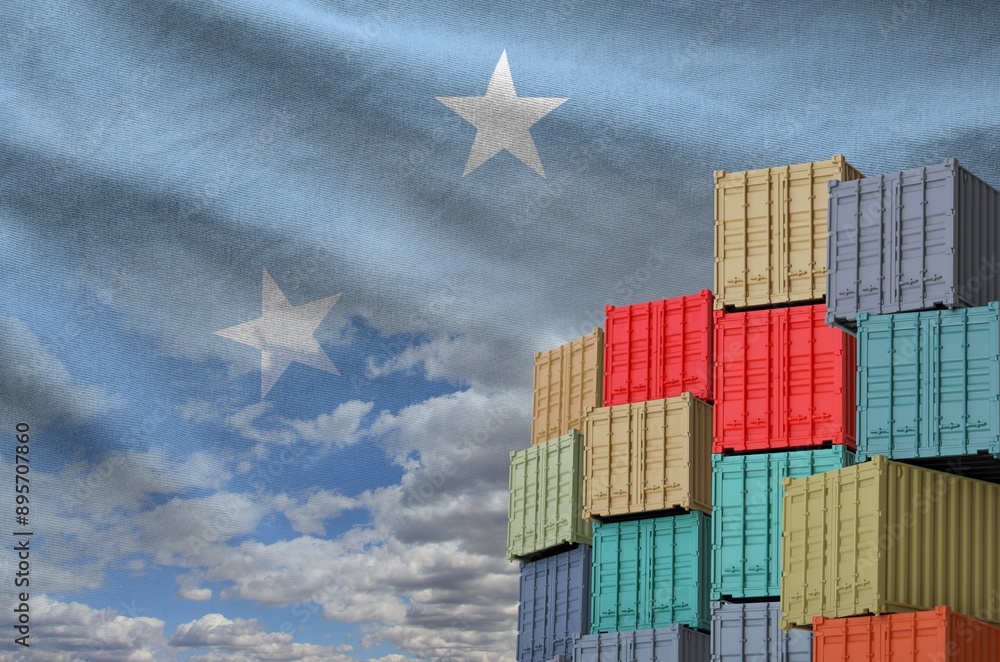 Micronesia flag and big stack of shipping cargo containers in docks with sky background close up