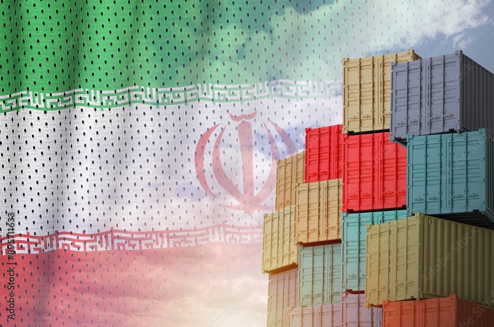 Iran flag and big stack of shipping cargo containers in docks with sky background close up