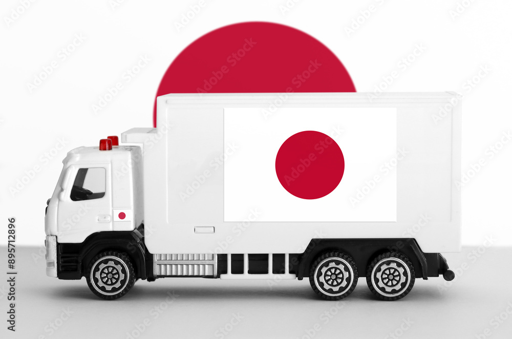 Japan flag depicted on side wall of white delivery van close up. Shipping and local delivery concept